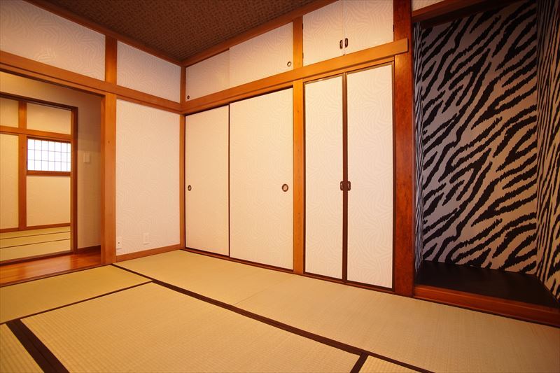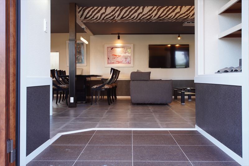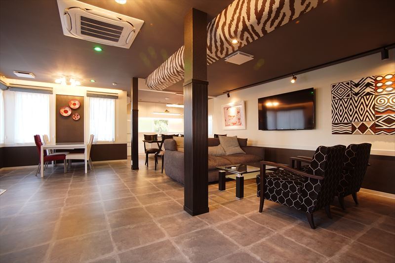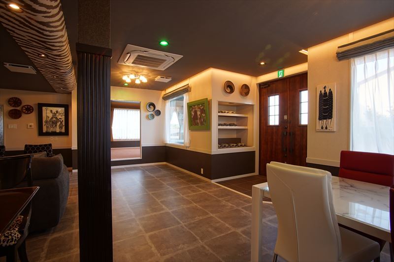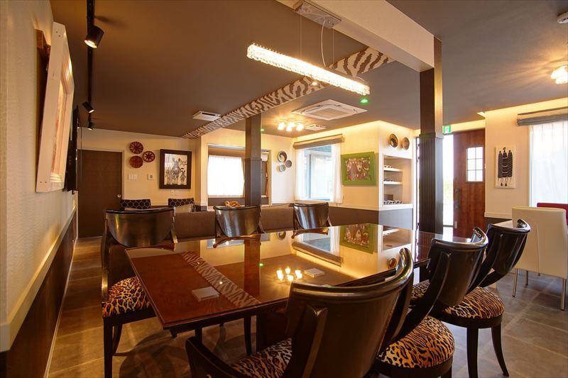令和2年内外装リフォーム 貸別荘営業中アフリカンハウス お風呂3畳 屋根ありBBQコーナー 駐車場・広いデッキ付き ヒョウ柄のダイニングセット・床・壁